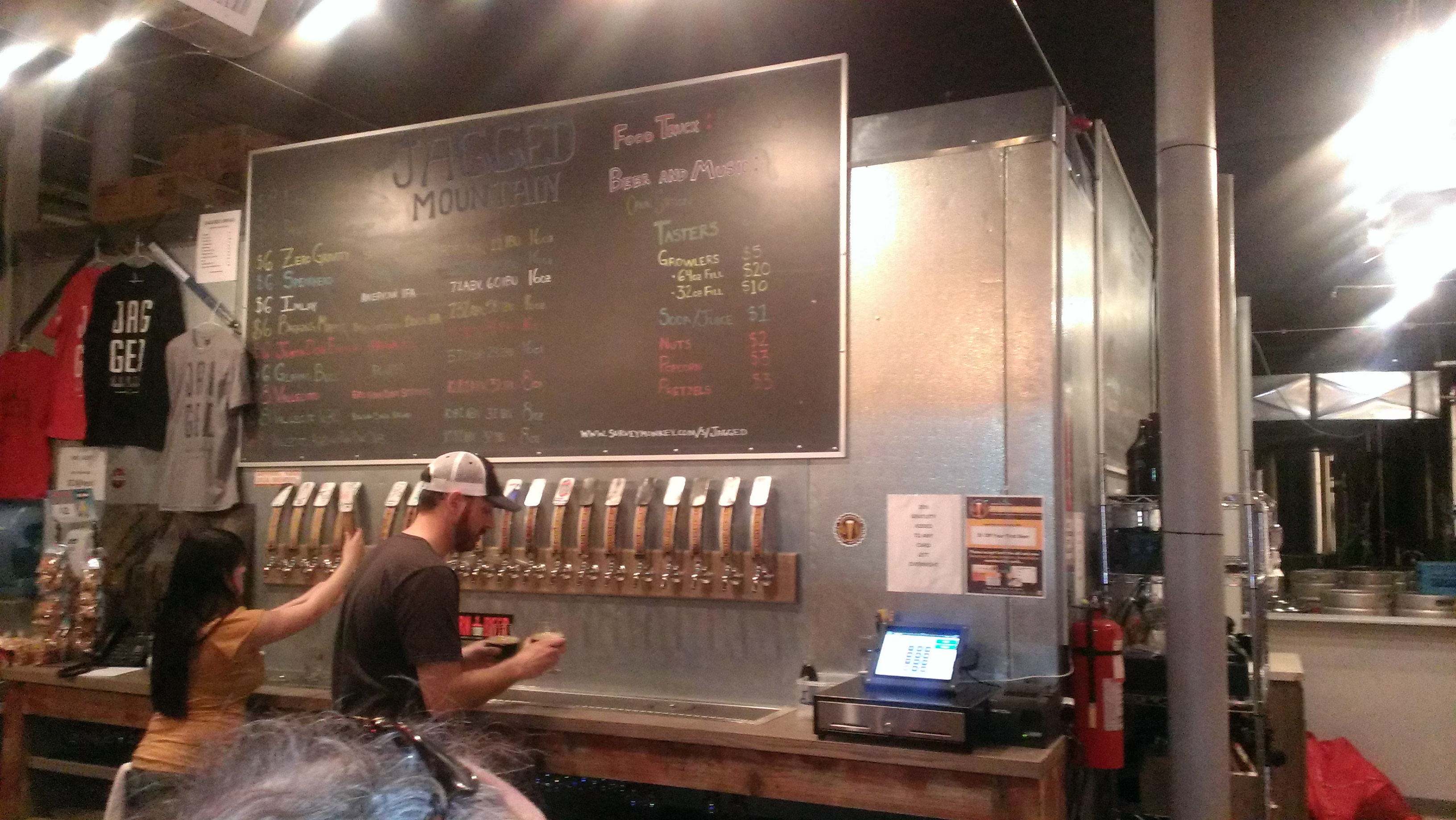 Our next stop was Jagged Mountain, which I had never heard of before. It houses a considerably bigger taproom with an “L”-shaped bar and lots of seating at tables. They also had a local food truck outside. There was a folk band playing when we got there and it was a really fun atmosphere. I sampled 2 beers – The Spearhead Saison, which was decent, and the Vallecito Rum Barrel Aged Belgian Strong Ale. I was curious about the rum barrel aged beer, but I wasn’t in love with the pairing of Belgian and rum. It still got 3 stars from me.
