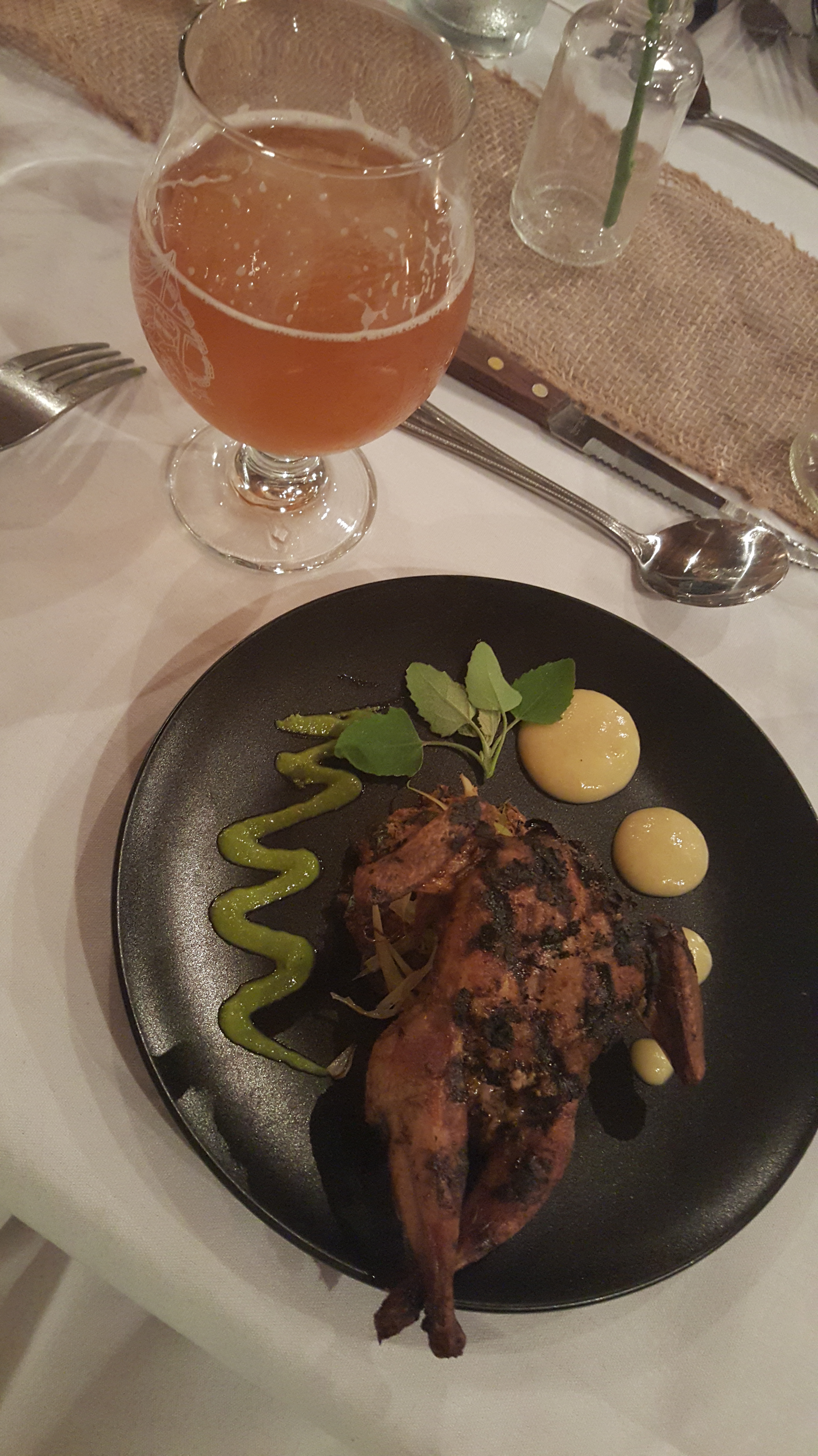 Fourth Course: Curried quail with paw paw ginger sauce, roasted daylily shoots, cleaver pesto, lambsquarter, spinach, and young garlic pakora paired with Cryin’ Holy Double IPA