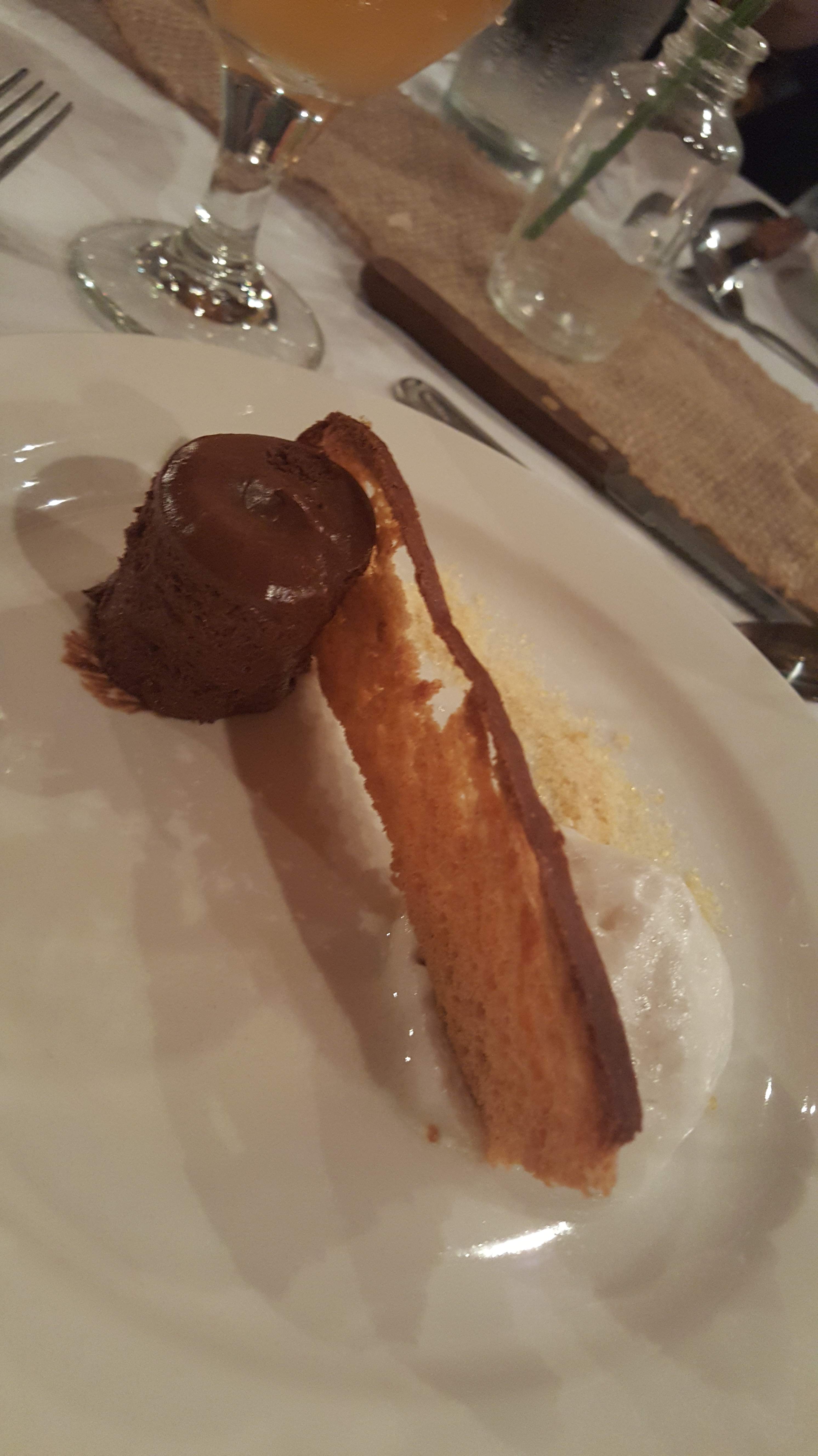 Fifth Course: Dark chocolate mousse with pine needle merengue, orange froth, sweet focaccia, and caramel powder paired with Turn Table Session Saison